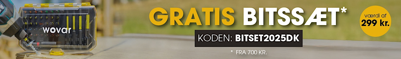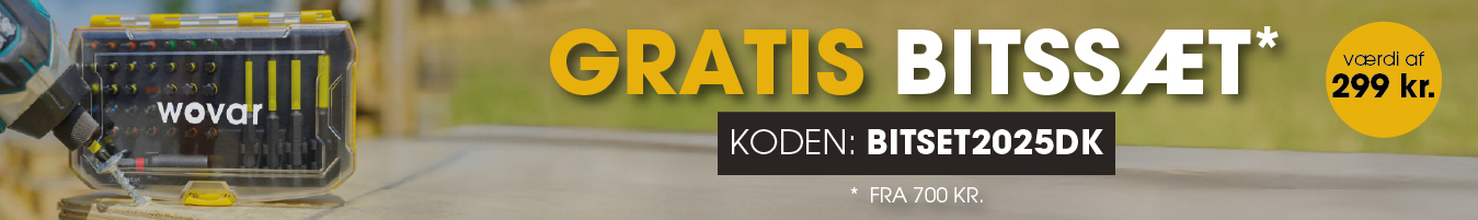 Modtag et gratis 41-delt Impact Bit Sæt til en værdi af 299KR. ved enhver ordre over 700KR, når du bruger koden BITSET2025DK.